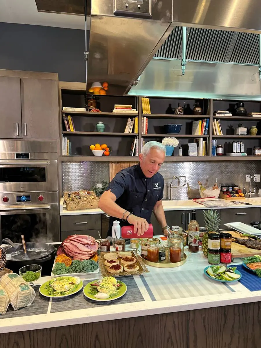 The 45-minute show covered a complete day of summer entertaining recipe options. “I'm going to start with breakfast… I'm an egg hound," Zakarian said, cueing up his spin on eggs Benedict. He used spiral ham on a Wolferman's English muffin as the base for lightly poached eggs. (Turns out he's been a fan of Wolferman English muffins for 30 years, having used them in one of his early restaurants, 44 Royalton, and uses them for burgers as well as eggs.) Top the eggs with hollandaise sauce and chopped chives, then crack pepper over them. Zakarian stressed the versatility of hollandaise: It can be adapted for a variety of recipes, such as by adding hot sauce, and you can prepare it about an hour before serving.