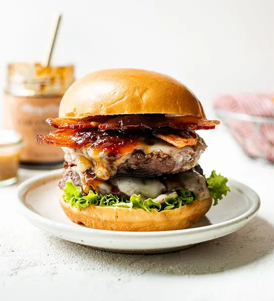 • Place the grilled burgers, cooked bacon, and toasted buns on individual platters. Set up your burger bar by placing the platters on a table or serving station, along with your toppings and condiments of choice.