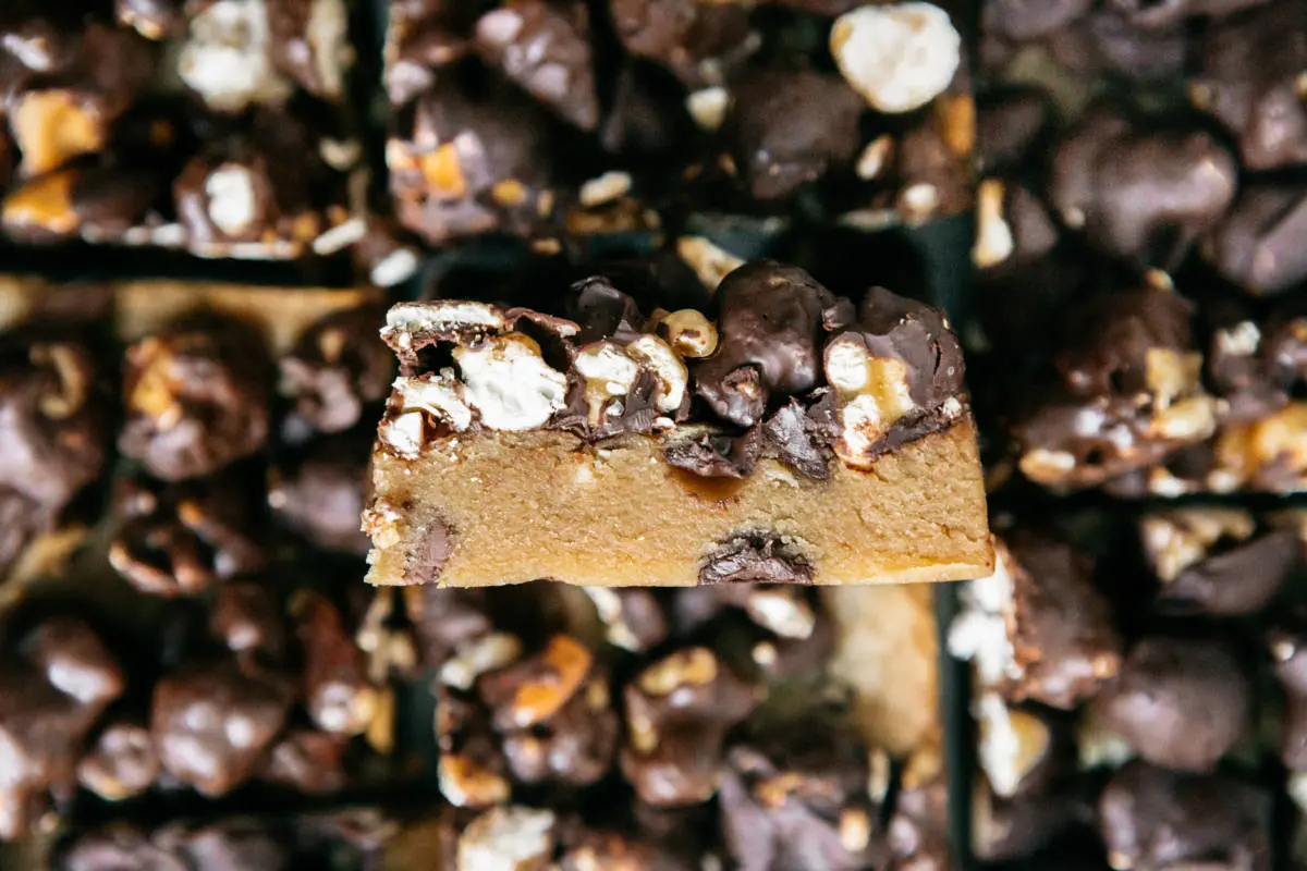 There's no denying that Moose Munch is fabulous on its own. It's hard for me to get through making this recipe without snacking on a handful or two! When you bake this topping onto our cookie bar, it does not lose any of its crunch or distinct flavor; it simply melts together with the cookie base to amplify the variety of chocolates, flavors, and textures. I used both milk and dark chocolate Moose Munch, but you could also experiment with other flavors like s'mores or butterscotch.