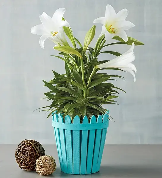 Flowers and Easter go together like, well chocolate and Easter. Wow that special someone with a vibrant Easter Lily plant. These large, white, trumpet-shaped flowers are delightfully fragrant and especially vibrant during the spring season. This one comes nestled in a lovely ceramic planter painted with buzzing bees.