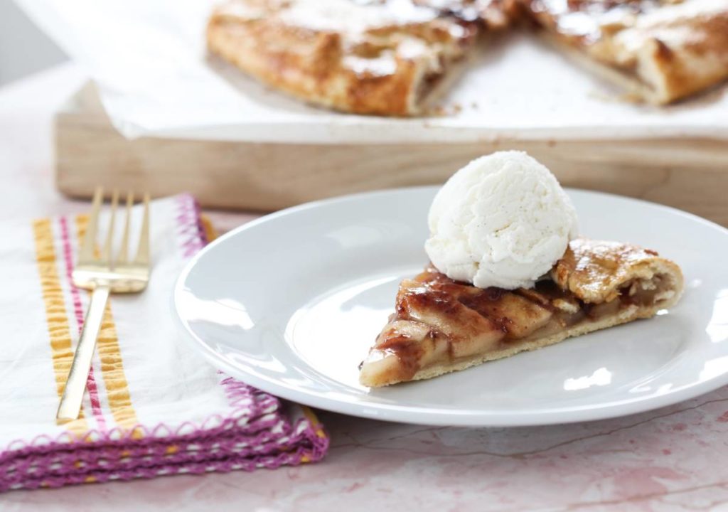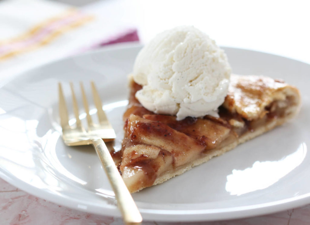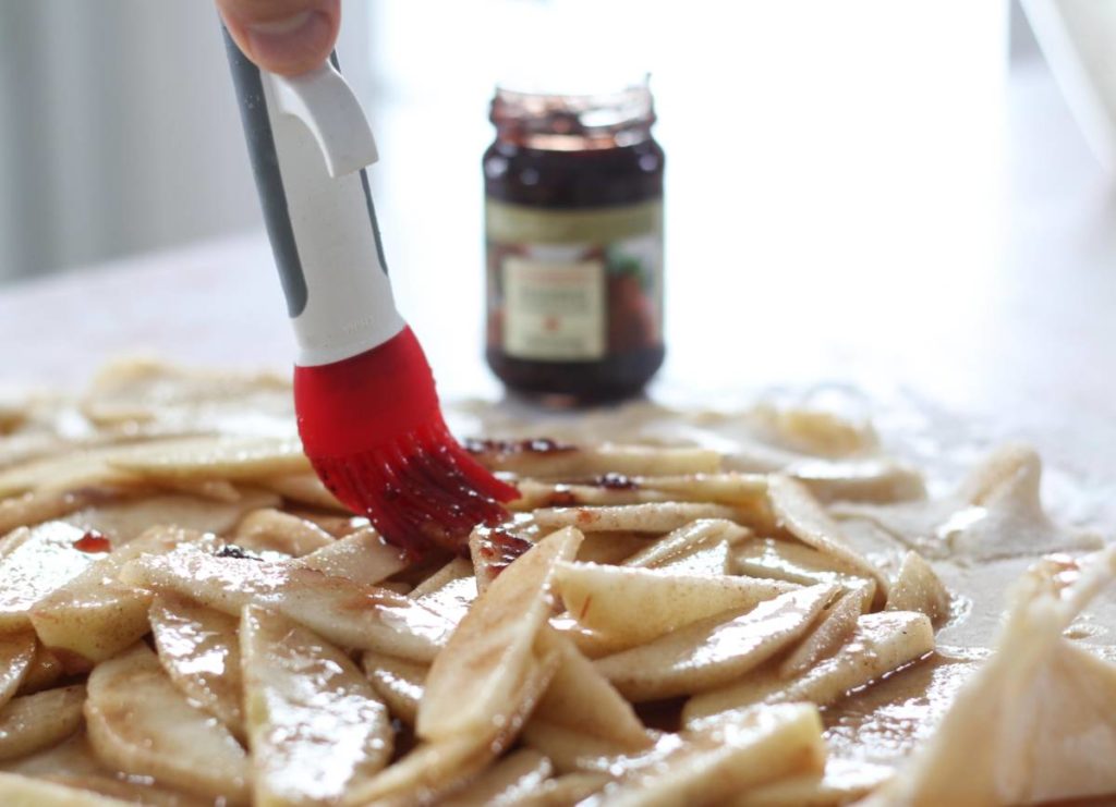 To amp up the flavor of the crostata even more, I also made use of the strawberry preserves in my basket. Before folding up this rustic pie, I gave my apples a generous coat of these sweet preserves. Again, this added another level of flavor which pairs perfectly with the apple and a big scoop of vanilla ice cream, which you’ll add just before serving. (In my book, vanilla ice cream is a must for any fruit pie.)