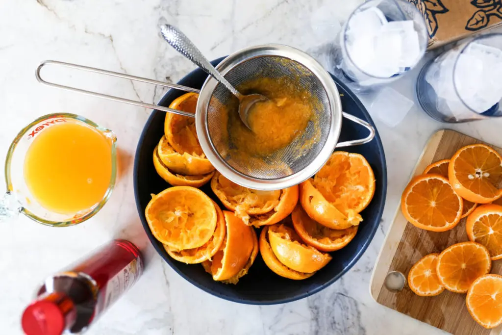 - Slice the oranges in half and squeeze them until you've collected 1 1/2 cups (12 ounces) of juice. Strain the juice through a fine mesh sieve into a clean container. Discard any pulp and seeds.